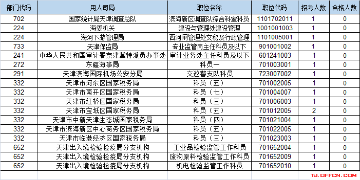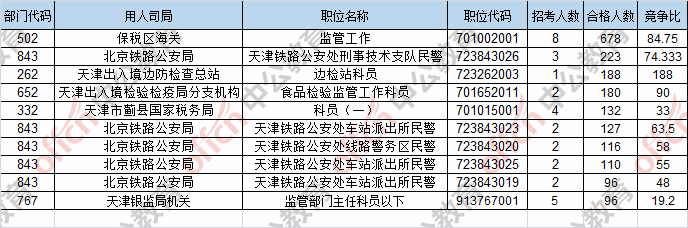 報名通過審核人數(shù)前十的職位主要集中在天津出入境邊防檢查總站、天津出入境檢驗檢疫局分支機構(gòu)、保稅區(qū)海關(guān),具體信息如下: