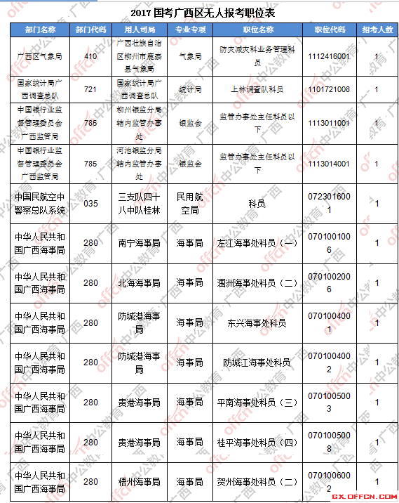 截止到21日8時(shí),工作地點(diǎn)在廣西的職位共有23個(gè)無(wú)人報(bào)考,占全部職位的3.6%。下面是部分廣西無(wú)人報(bào)考職位一覽表,廣西中公網(wǎng)校專家建議廣大考生結(jié)合自身?xiàng)l件,根據(jù)自己的實(shí)際情況找到屬于自己的職位,避免激烈競(jìng)爭(zhēng)。