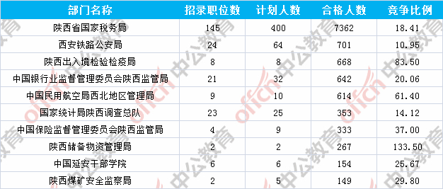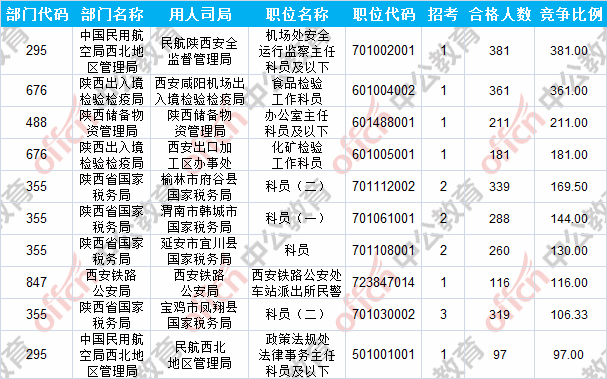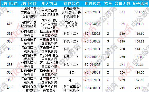 報(bào)名通過審核人數(shù)前十的職位主要集中在陜西出入境檢驗(yàn)檢疫局、陜西省國(guó)家稅務(wù)局、中國(guó)民用航空局西北地區(qū)管理局等部門,具體信息如下: