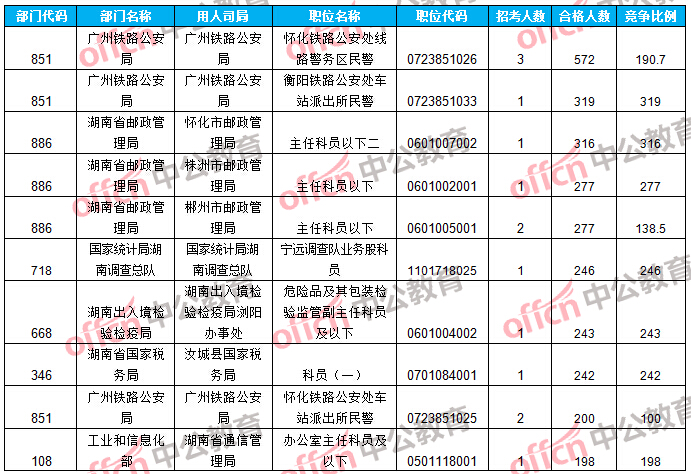 報名通過審核人數(shù)前十的職位主要集中在廣州鐵路公安局、國家統(tǒng)計局湖南調(diào)查總隊等部門,具體信息如下: