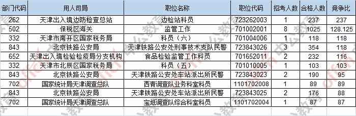 報名通過審核人數(shù)前十的職位主要集中在保稅區(qū)海關(guān)、北京鐵路公安局、天津出入境邊防檢查總站,具體信息如下: