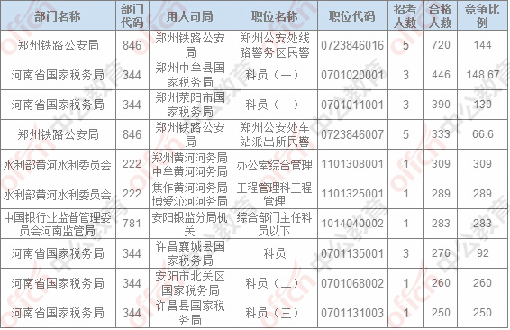 報名通過審核人數(shù)排名前列的職位主要集中在鄭州鐵路公安局、河南省國家稅務局,水利部黃河水利委員會,具體信息如下: