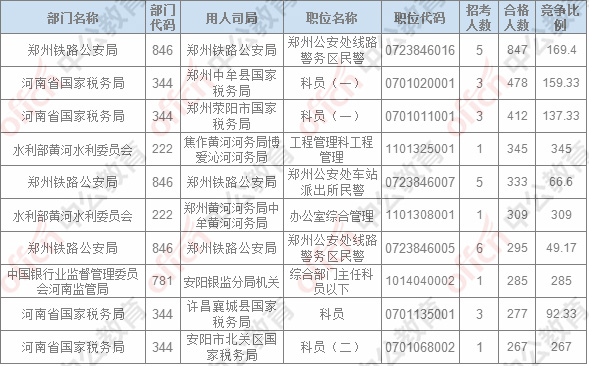 報名通過審核人數(shù)排名前列的職位主要集中在鄭州鐵路公安局、河南省國家稅務(wù)局,水利部黃河水利委員會,具體信息如下: