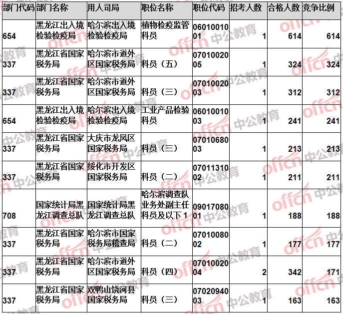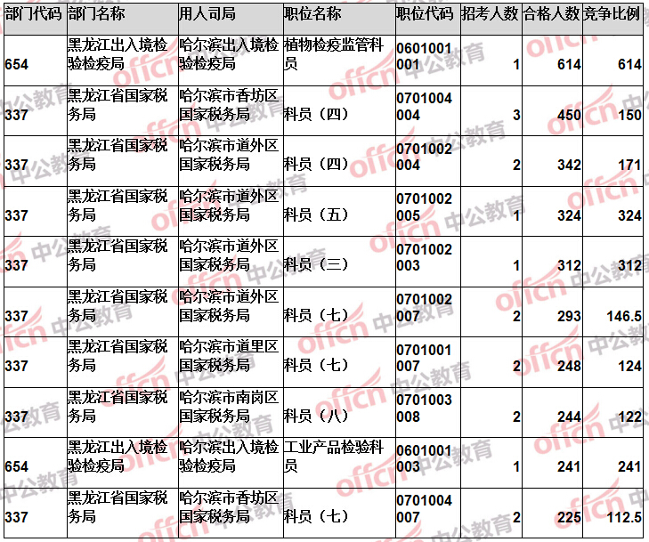 報名通過審核人數(shù)前十的職位主要集中在黑龍江省國家稅務(wù)局、黑龍江出入境檢驗檢疫局、哈爾濱鐵路公安局等部門,具體信息如下: