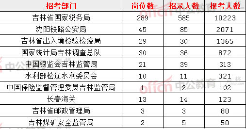 截止到23日8時,競爭比例的職位為吉林鐵路公安處線路警務區(qū)民警一職,招錄4人,截止到23日8時通過人數(shù)為894人。其次為吉林省國稅局部門。
