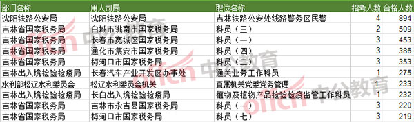報名通過審核人數(shù)前十的職位主要集中在吉林省國稅局和吉林出入境檢驗檢疫局,具體信息如下: