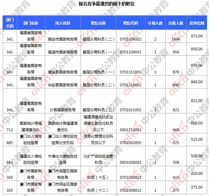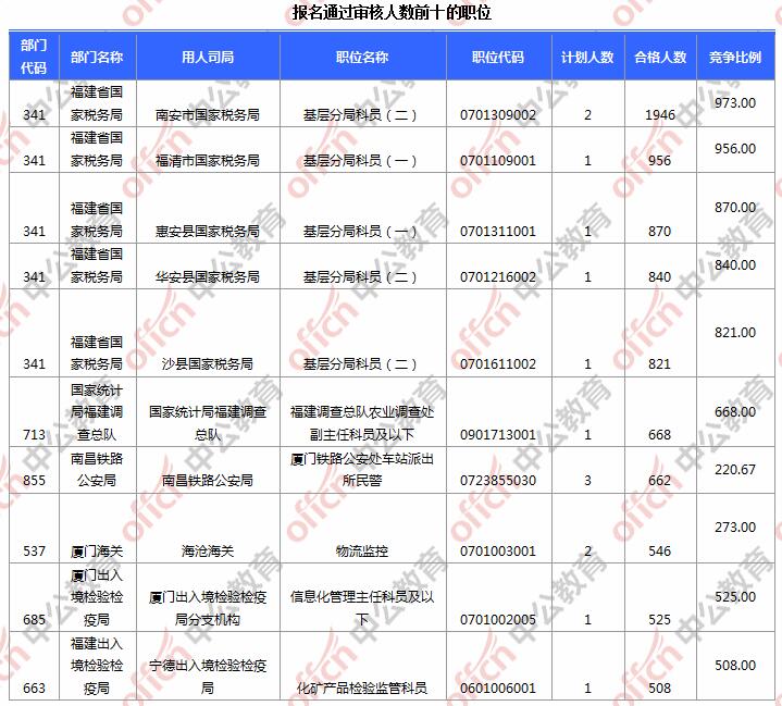 報(bào)名通過(guò)審核人數(shù)前十的職位主要集中在南安市國(guó)家稅務(wù)局、福清市國(guó)家稅務(wù)局、惠安縣國(guó)家稅務(wù)局等部門(mén),具體信息如下: