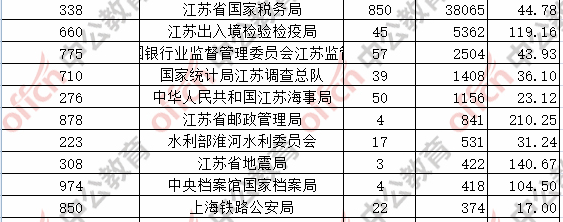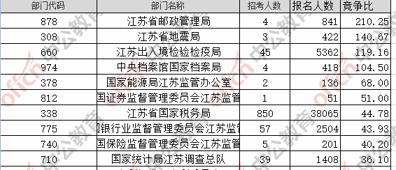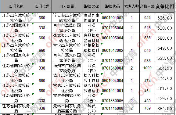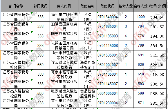 報(bào)名通過審核人數(shù)前十的職位主要集中在江蘇省國家稅務(wù)局、江蘇出入境檢驗(yàn)檢疫局,具體信息如下: