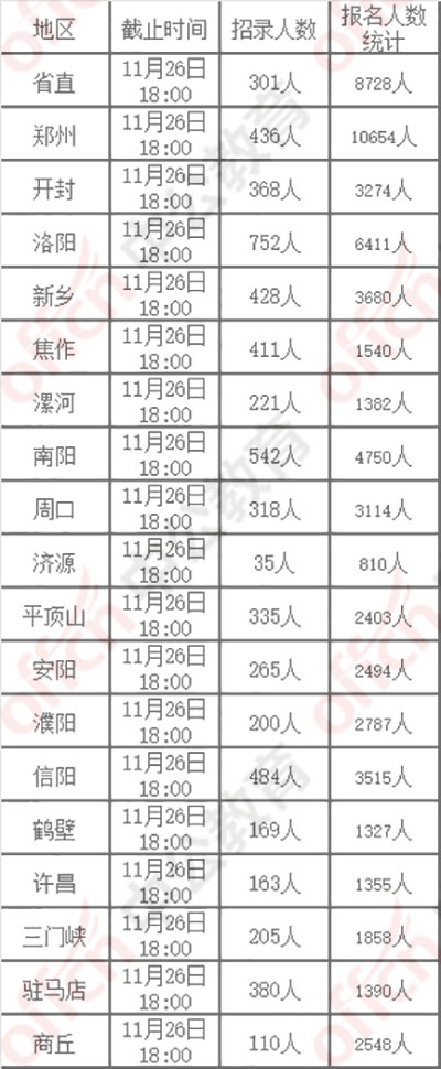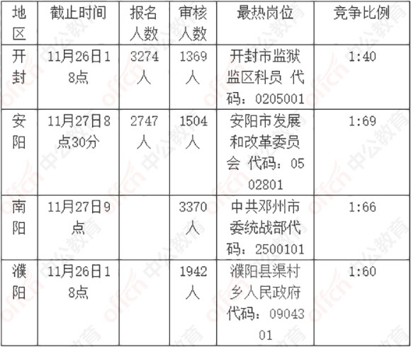 中公教育還就各地區(qū)的各崗位具體報(bào)名人數(shù)進(jìn)行了統(tǒng)計(jì)分析,截至11月26日,河南省考部分地區(qū)崗位的具體報(bào)名情況如下: