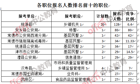 為幫助廣大考生更清晰的了解報(bào)名情況,中公教育整理了常德市各職位的報(bào)名人數(shù)排名以及競(jìng)爭(zhēng)比例排名,供廣大考生參考: