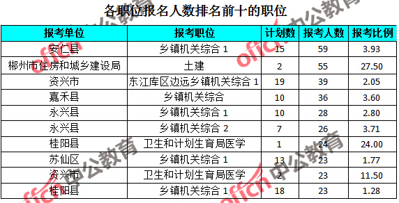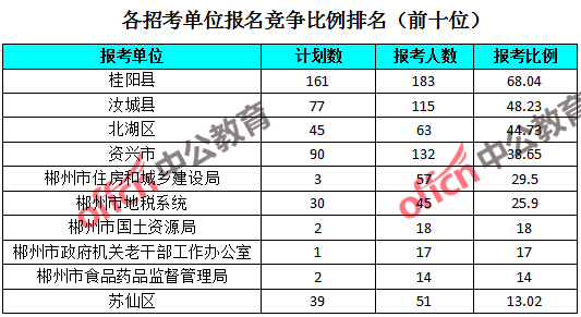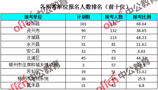 競爭熱門招考單位,前三位依次是:桂陽縣(競爭比例68.04:1)、汝城縣(競爭比例48.23:1)和北湖區(qū)(競爭比例44.73:1)。