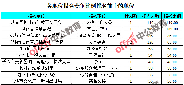 為幫助廣大考生更清晰的了解報(bào)名情況,中公教育整理了郴州市各招考單位的報(bào)名人數(shù)排名以及競爭比例排名,供廣大考生參考: