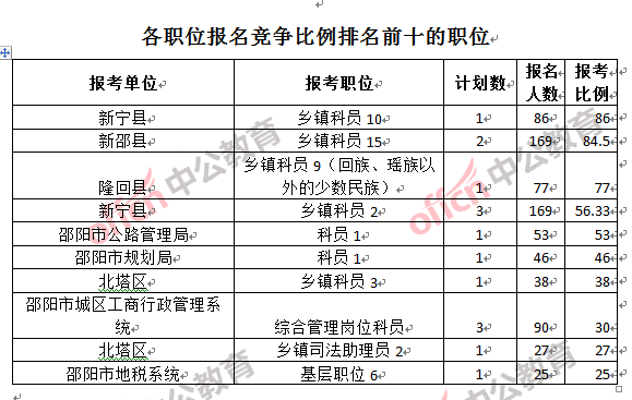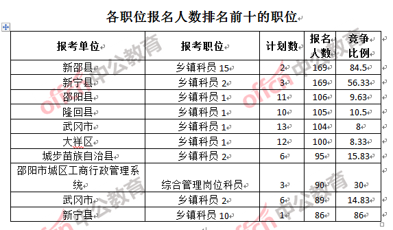 為幫助廣大考生更清晰的了解報名情況,中公教育整理了邵陽市各職位的報名人數排名以及競爭比例排名,供廣大考生參考: