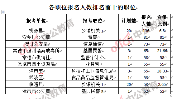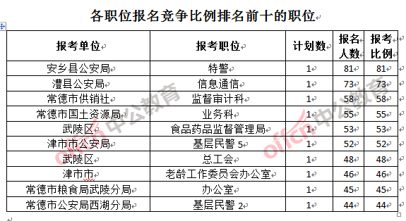 競爭熱門職位,前三位依次是:安鄉(xiāng)縣公安局特警(競爭比例81:1)、澧縣公安局信息通信(競爭比例73:1)和常德市供銷社監(jiān)督審計科(競爭比例58:1)。