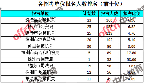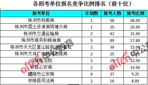 競爭熱門招考單位,前三位依次是:株洲市檔案局(競爭比例58:1)、株洲市國土資源局荷塘分局(競爭比例25:1)和株洲市交通運輸局(競爭比例21:1)。