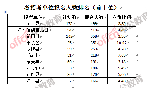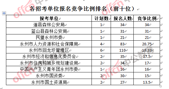 競(jìng)爭(zhēng)熱門招考單位,前三位依次是:道縣森林公安局(競(jìng)爭(zhēng)比例34:1)、藍(lán)山縣森林公安局(競(jìng)爭(zhēng)比例31:1)和民盟永州市委(競(jìng)爭(zhēng)比例21:1)。
