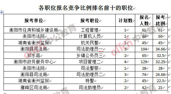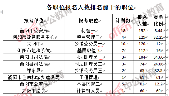為幫助廣大考生更清晰的了解報(bào)名情況,中公教育整理了衡陽市各職位的報(bào)名人數(shù)排名以及競爭比例排名,供廣大考生參考: