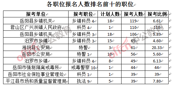 競爭最熱門職位,前三依次是:君山區(qū)廣興洲鎮(zhèn)人民政府科員4(競爭比例110:1)、岳陽市強制隔離戒毒所戒毒警察10(競爭比例44:1)和岳陽市社會保險事業(yè)管理處科員1(競爭比例39:1)。