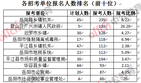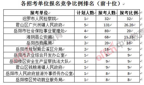 競(jìng)爭(zhēng)熱門招考單位,前三位依次是:汨羅市人民檢察院(競(jìng)爭(zhēng)比例32:1)、君山區(qū)廣興洲鎮(zhèn)人民政府(競(jìng)爭(zhēng)比例26.2:1)和岳陽(yáng)市社會(huì)保險(xiǎn)事業(yè)管理處(競(jìng)爭(zhēng)比例20:1)。