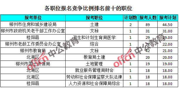 競(jìng)爭(zhēng)熱門職位,前三位依次是:郴州市住房和城鄉(xiāng)建設(shè)局土建(競(jìng)爭(zhēng)比例44.5:1)、郴州市政府機(jī)關(guān)老干部工作辦公室文秘(競(jìng)爭(zhēng)比例31:1)和桂陽縣衛(wèi)生和計(jì)劃生育局醫(yī)學(xué)(競(jìng)爭(zhēng)比例29:1)。