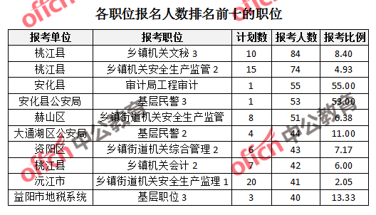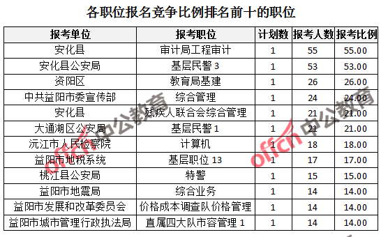 競爭熱門職位,前三位依次是:安化縣審計(jì)局工程審計(jì)(競爭比例55:1)、安化縣公安局基層民警3(競爭比例53:1)、資陽區(qū)教育局基建(競爭比例26:1)。