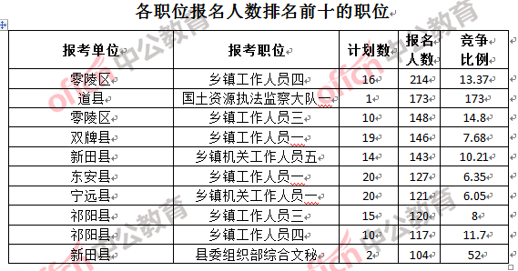 競爭熱門招考單位,前三位依次是:道縣森林公安局(競爭比例55:1)、中國共產(chǎn)主義青年團(tuán)永州市委(競爭比例32:1)和永州市回龍圩管理區(qū)(競爭比例28.83:1)。