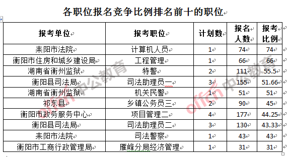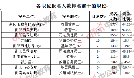 為幫助廣大考生更清晰的了解報名情況,中公教育整理了衡陽市各職位的報名人數(shù)排名以及競爭比例排名,供廣大考生參考: