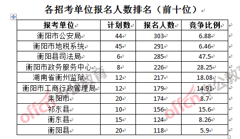 為幫助廣大考生更清晰的了解報名情況,中公教育整理了衡陽各招考單位的報名人數(shù)排名以及競爭比例排名,供廣大考生參考: