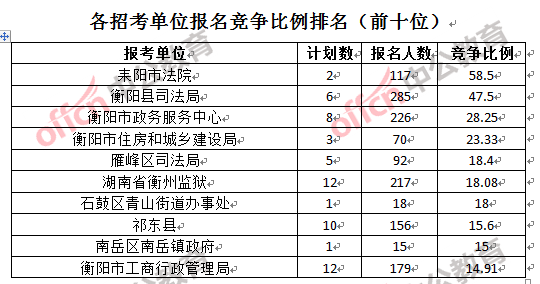 競爭熱門招考單位,前三位依次是:耒陽市法院(競爭比例58.5:1)、衡陽縣司法局(競爭比例47.5:1)和衡陽市政務服務中心(競爭比例28.25:1)。