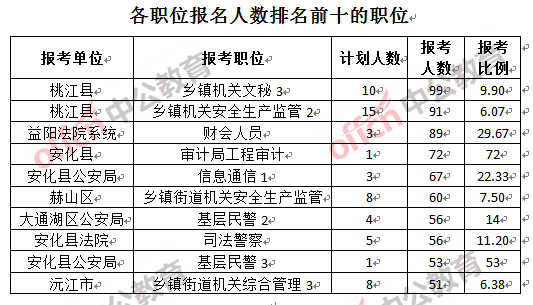 競爭最熱門職位,前三位依次是:安化縣審計(jì)局工程審計(jì)(競爭比例72:1)、安化縣公安局基層民警3(競爭比例53:1)和資陽區(qū)司法局社區(qū)矯正1(競爭比例48:1)。