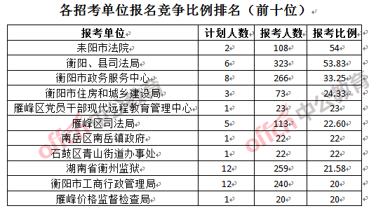 競爭熱門招考單位,前三位依次是:耒陽市法院(競爭比例54:1)、衡陽縣司法局(競爭比例53.83:1)和衡陽市政務服務中心(競爭比例33.25:1)。