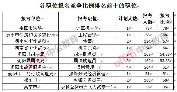 競爭最熱門職位,前三依次是:耒陽市法院計算機人員(競爭比例78:1)、衡陽市住房和城鄉(xiāng)建設局工程管理(競爭比例68:1)和湖南省衡州監(jiān)獄特警(競爭比例67:1)。