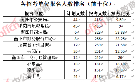 為幫助廣大考生更清晰的了解報名情況,中公教育整理了衡陽市各招考單位的報名人數排名以及競爭比例排名,供廣大考生參考:
