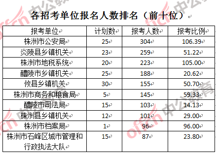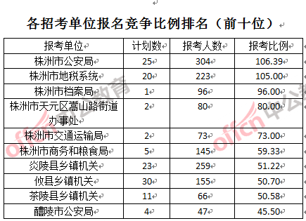 競(jìng)爭(zhēng)熱門招考單位,前三位依次是:株洲市公安局 (競(jìng)爭(zhēng)比例106:1)、株洲市地稅系統(tǒng)(競(jìng)爭(zhēng)比例105:1)和株洲市檔案局(競(jìng)爭(zhēng)比例96:1)。