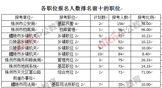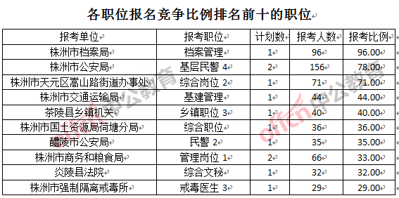 競(jìng)爭(zhēng)熱門職位,前三位依次是:株洲市檔案局檔案管理(競(jìng)爭(zhēng)比例96:1)、株洲市公安局基層民警4(競(jìng)爭(zhēng)比例78:1)、株洲市天元區(qū)嵩山路街道辦事處綜合崗位2(競(jìng)爭(zhēng)比例71:1)。