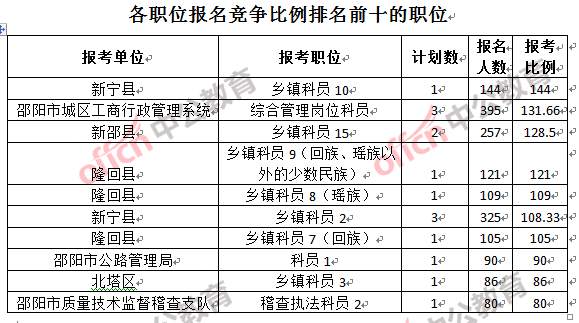 競爭熱門職位,前三位依次是:新寧縣鄉(xiāng)鎮(zhèn)科員10(競爭比例144:1)、邵陽市城區(qū)工商行政管理系統(tǒng)綜合管理崗位科員(競爭比例131.66:1)和新邵縣鄉(xiāng)鎮(zhèn)科員15(競爭比例128.5:1)。