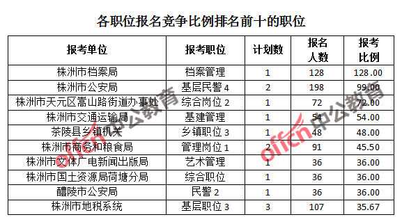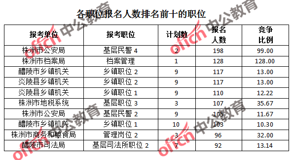 為幫助廣大考生更清晰的了解報名情況,中公網(wǎng)校整理了株洲市各職位的報名人數(shù)排名以及競爭比例排名,供廣大考生參考: