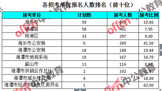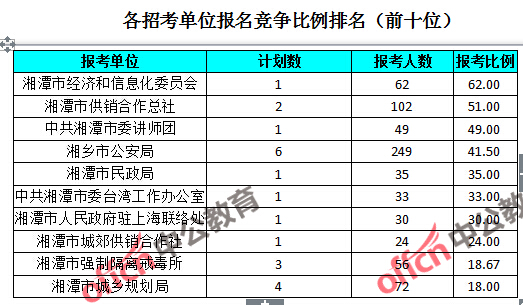 為幫助廣大考生更清晰的了解報名情況,中公網(wǎng)校整理了湘潭市各招考單位的報名人數(shù)排名以及競爭比例排名,供廣大考生參考: