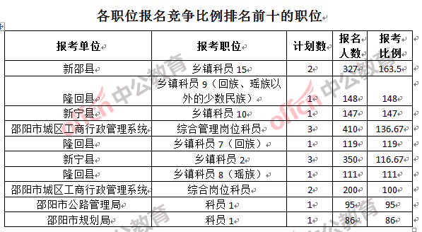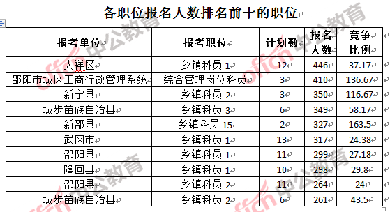 為幫助廣大考生更清晰的了解報名情況,中公網(wǎng)校整理了邵陽市各職位的報名人數(shù)排名以及競爭比例排名,供廣大考生參考:
