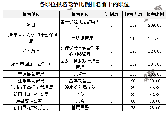 競(jìng)爭(zhēng)熱門職位,前三位依次是:道縣國(guó)土資源執(zhí)法監(jiān)察大隊(duì)一(競(jìng)爭(zhēng)比例209:1)、永州市人力資源和社會(huì)局人力資源管理(競(jìng)爭(zhēng)比例144:1)、冷水灘區(qū)醫(yī)療保險(xiǎn)基金管理中心網(wǎng)絡(luò)管理(競(jìng)爭(zhēng)比例120:1)。