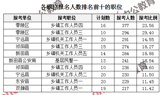 為幫助廣大考生更清晰的了解報(bào)名情況,中公網(wǎng)校整理了永州市各職位的報(bào)名人數(shù)排名以及競(jìng)爭(zhēng)比例排名,供廣大考生參考: