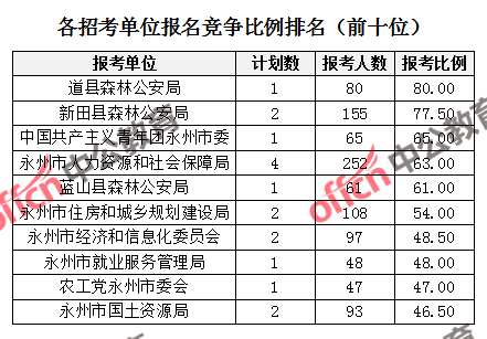 競爭熱門招考單位,前三位依次是:道縣森林公安局(競爭比例80:1)、新田縣森林公安局(競爭比例77.5:1)、中國共產(chǎn)主義青年團永州市委(競爭比例65:1)。