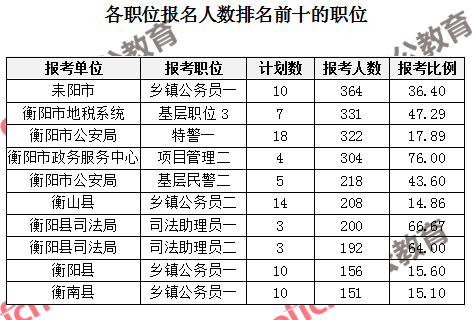 為幫助廣大考生更清晰的了解報名情況,中公網(wǎng)校整理了衡陽市各職位的報名人數(shù)排名以及競爭比例排名,供廣大考生參考: