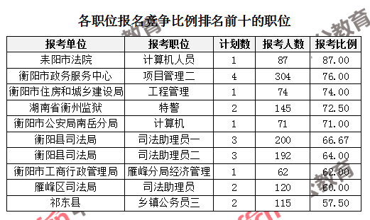 競爭熱門職位,前三位依次是:耒陽市法院計算機人員(競爭比例87:1)、衡陽市政務(wù)服務(wù)中心項目管理二(競爭比例76:1)、衡陽市住房和城鄉(xiāng)建設(shè)局工程管理(競爭比例74:1)。