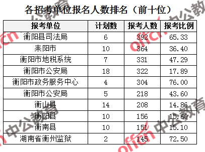 為幫助廣大考生更清晰的了解報名情況,中公網(wǎng)校整理了衡陽市各招考單位的報名人數(shù)排名以及競爭比例排名,供廣大考生參考: