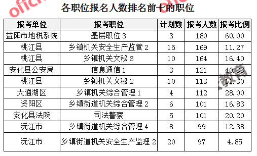 截止27日17時(shí),2017年益陽(yáng)公務(wù)員報(bào)名人數(shù)最多的前三個(gè)職位為益陽(yáng)市地稅系統(tǒng)基層職位3(180人報(bào)名)、桃江縣鄉(xiāng)鎮(zhèn)機(jī)關(guān)安全生產(chǎn)監(jiān)管2(169人報(bào)名)、桃江縣鄉(xiāng)鎮(zhèn)機(jī)關(guān)文秘3(164人報(bào)名)。