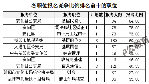 競(jìng)爭(zhēng)熱門(mén)職位,前三位依次是:安化縣公安局基層民警3(競(jìng)爭(zhēng)比例84:1)、資陽(yáng)區(qū)司法局社區(qū)矯正1(競(jìng)爭(zhēng)比例78:1)、安化縣審計(jì)局工程審計(jì)(競(jìng)爭(zhēng)比例73:1)。