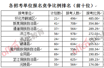 競爭熱門招考單位,前三位依次是:懷化市鶴城區(qū)(競爭比例485:1)、新晃侗族自治縣(競爭比例354:1)和通道侗族自治縣(競爭比例289:1)。