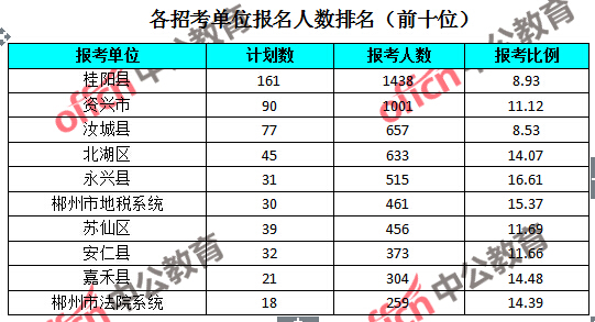 為幫助廣大考生更清晰的了解報(bào)名情況,中公網(wǎng)校整理了湖南郴州各招考單位的報(bào)名人數(shù)排名以及競(jìng)爭(zhēng)比例排名,供廣大考生參考: