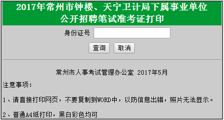 2017江蘇常州市鐘樓、天寧衛(wèi)計局下屬事業(yè)單位招聘筆試準考證打印入口